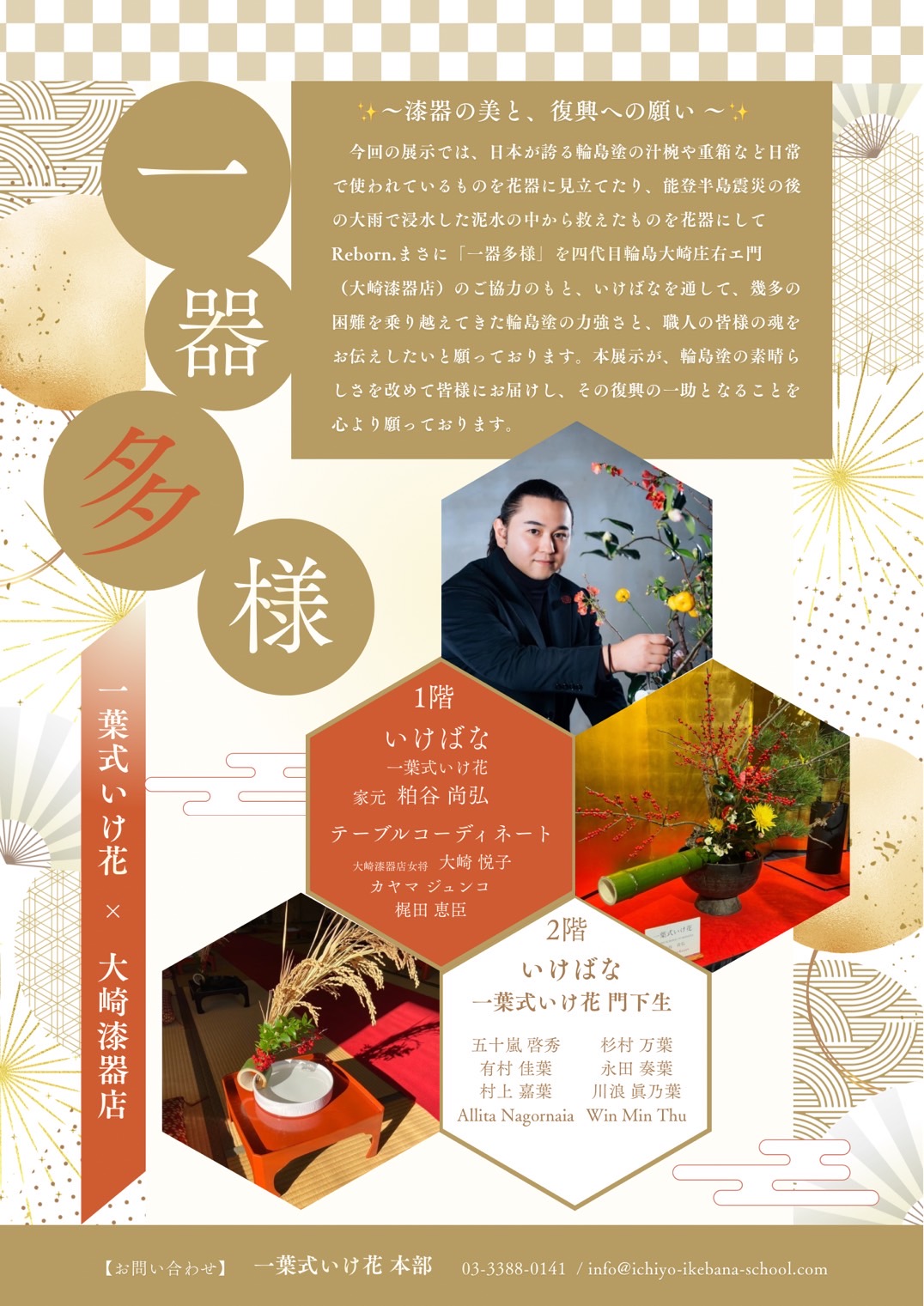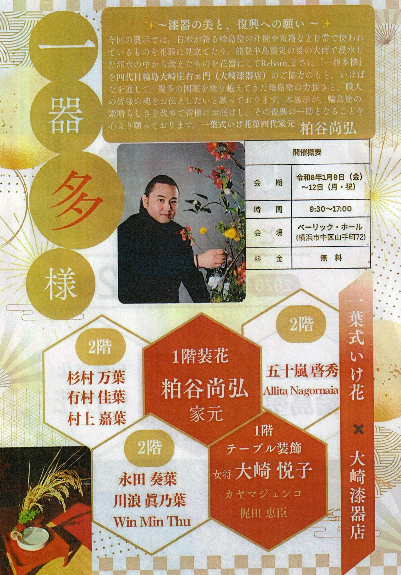 まさに「一器多様」を四代目輪島大崎庄右エ門(大崎漆器店)のご協力のもと、いけばなを通して、幾多の困難を乗り越えてきた輪島塗の力強さと、職人の皆様の魂をお伝えしたいと願っております。本展示が、輪島塗の素晴らしさを改めて皆様にお届けし、その復興の一助となることを心より願っております。